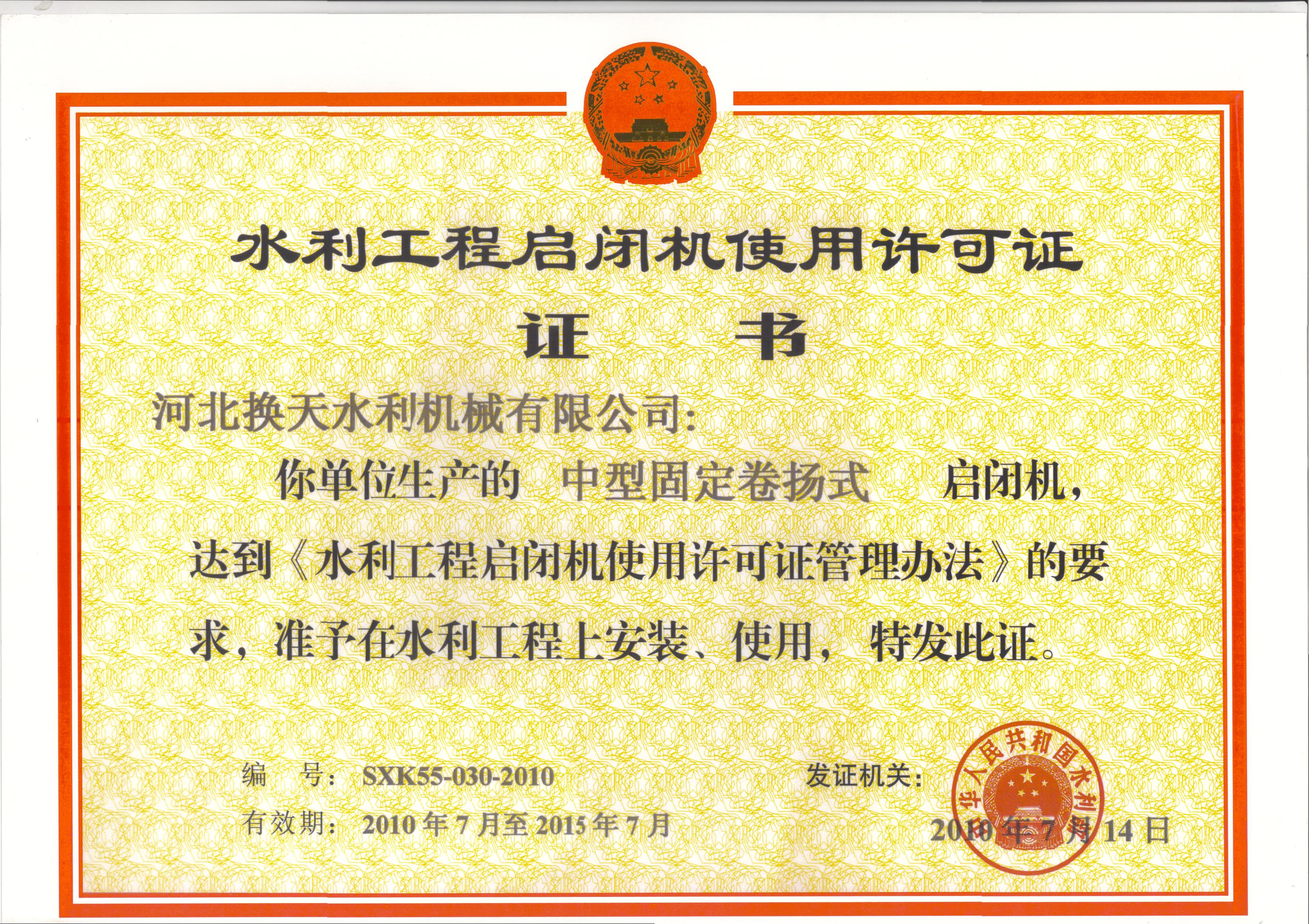 水利工程啟閉機使用許可證